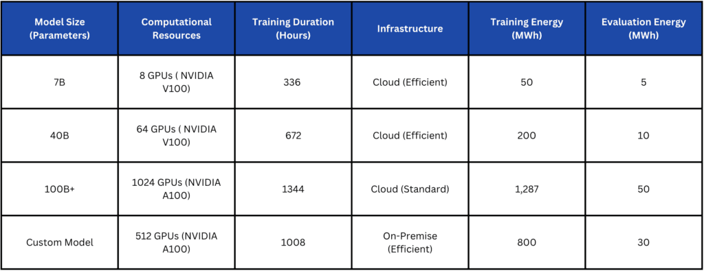 The energy consumption of LLMs varies across different stages, including training, evaluation, and inference. The following table provides an overview of the estimated energy consumption for models of varying sizes:
